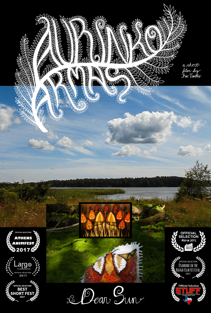 Aurinko Armas (2017) on kokeellinen neuleanimaatio, joka sai alkunsa kiinnostuksesta luontoon, sarjakuviin ja neuletöihin. Elokuva yhdistelee kahta eri animaatiotekniikkaa, stop motion animaatiota sekä pala-animaatiota ja elokuvan neulehahmon esikuvana on ollut kettu. Livekuvaakin elokuvassa on käytetty. Tarkoituksenani oli hyödyntää elokuvan tekemisessä kaikenlaisia materiaaleja ja laitteita ”mitä kodin kaapeista löytyy”. Projekti kasvoi edetessään paljon ja lopputulos on nähtävissä ylläolevalla videolla (painathan HD-nappia!).
